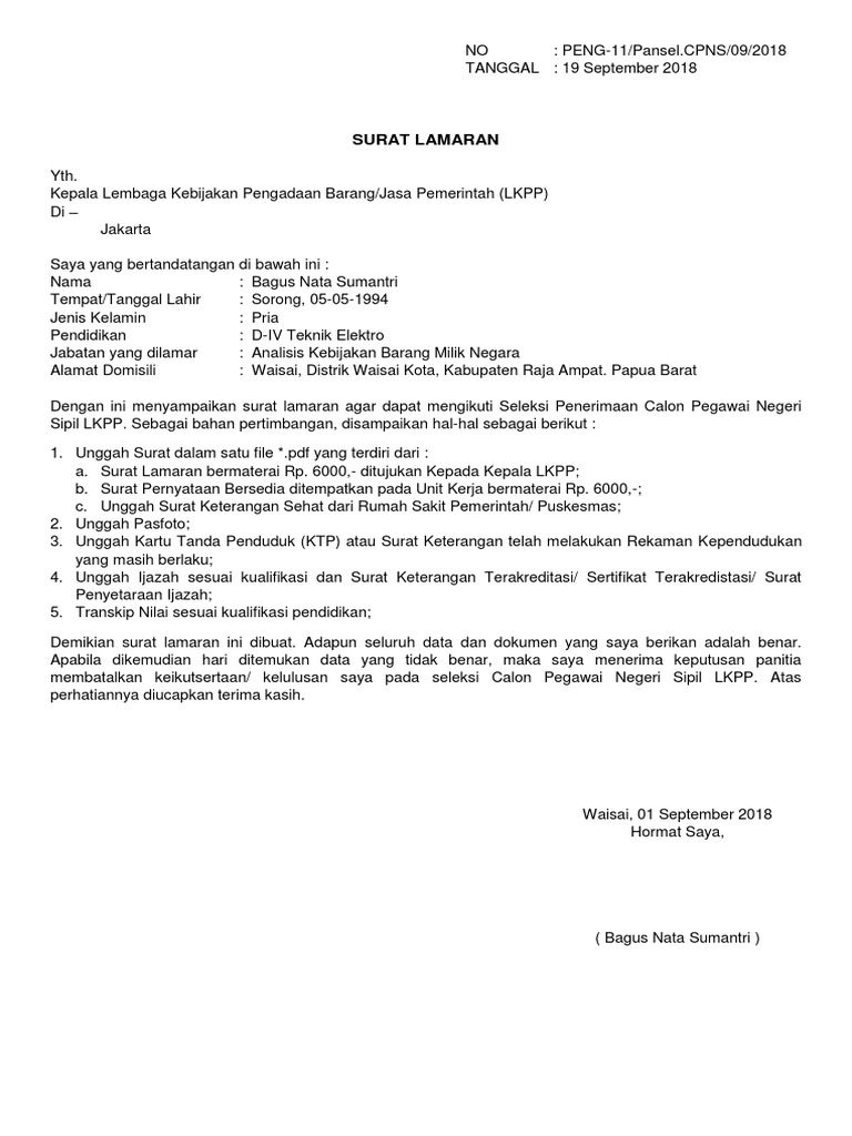 Contoh surat lamaran lkpp. Namun saya ingatkan terlebih dulu bahwa pada postingan sebelumnya saya sudah share contoh surat lamaran kerja honorer pemdaapabila anda membutuhkan referensi dalam menulis surat lamaran pekerjaan honorer pemda silahkan. Contoh surat lamaran kerja lkpp. Mudah mudahan isi postingan artikel contoh cv artikel contoh daftar riwayat hidup artikel contoh lamaran kerja artikel contoh surat izin sekolah. Contoh surat lamaran kerja ke lkpp contoh surat lamaran kerja contoh surat lamaran bahasa inggris contoh surat lamaran kerja yang baik dan benar contoh surat lamaran kerja dan cv contoh surat lamaran kerja via email contoh surat lamaran cpns contoh surat lamaran kerja 2018 contoh surat lamaran kemenkumham contoh surat lamaran cpns kemenkumham 2017 contoh surat lamaran cpns 2018. Contoh file berikut ini adalah kumpulan dari berbagi sumber tentang contoh surat lamaran kerja lkpp yang bisa bapakibu gunakan dan diunduh secara gratis dengan menekan tombol download biru dibawah ini. Contoh format surat lamaran cpns dan surat pernyataan yang digunakan untuk mendaftar untuk rekrutmen cpns tahun anggaran 2019 ini telah kami ambil langsung dari website sscnbkngoid format surat lamaran dan surat pernyataan ini bisa anda download file aslinya berbentuk microsoft word.