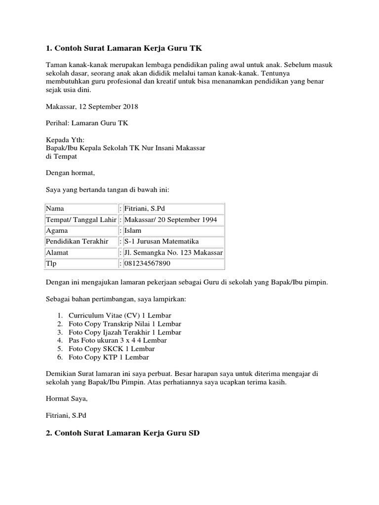 Walaupun memiliki pendidikan yang lumayan namun belum bisa menjamin kalau seseorang itu akan mendapatkan pekerjaan dengan mudah. Atas perhatiannya saya ucapkan terima kasih. Kepada yth bapak ibu kepala sekolah smp negeri 1 medan di tempat. Sedangkan pada kesempa kali ini mimin ingin berbagi tentang contoh surat lamaran kerja guru yang baik dan benar. 15 contoh surat lamaran kerja guru paling lengkap memiliki pekerjaan tentu merupakan sebuah anugerah bagi setiap orang. Bisa digunakan untuk melamar posisi guru sd smp sma smk ataupun sebagai guru bimbel pada sebuah lembaga swasta.