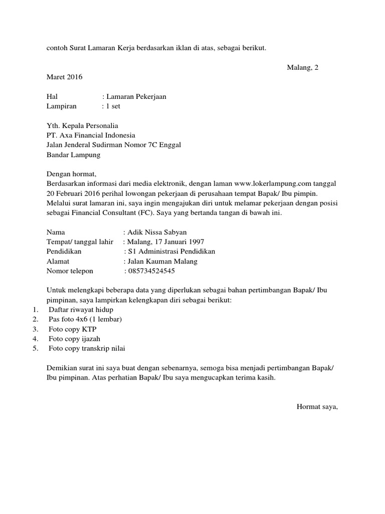 Contoh Surat Lamaran Kerja Berdasarkan Iklan Di Internet