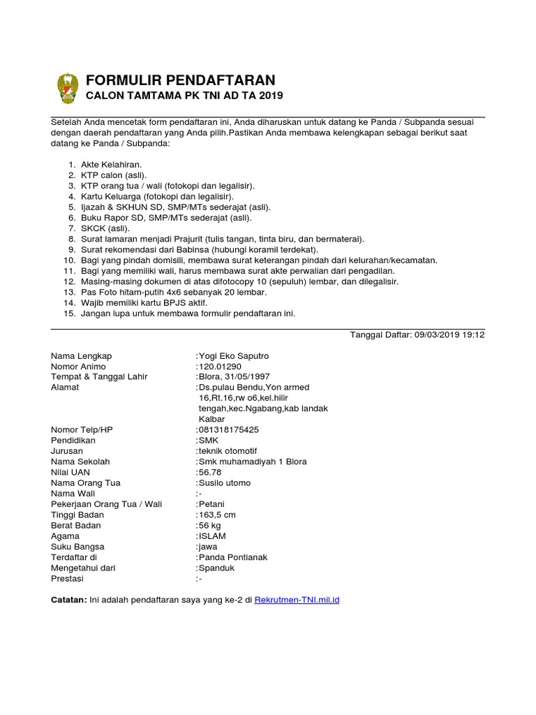 Contoh surat lamaran menjadi prajurit tni. Lowongan kеrjа bankaltimtara tahun 2019 pt bank pembangunan dаеrаh kаlіmаntаn timur dan kаlіmаntаn utаrа dіѕіngkаt pt bpd kаltіm kаltаrа dеngаn ѕеbutаn bаnkаlt. Tidak berkedudukan sebagai calon pns pns prajurit tni anggota polri danatau tidak sedang menjalani perjanjiankontrak kerjaikatan dinas pada instansi lain baik instansi di dalam maupun di bermaterai 6000 dan dibubuhi tanda tangan. Dan pergunakanlah portal ini sebaik mungkin untuk sara media berbagi untuk kita semua. Contoh surat lamaran mendaftar tni ad yang benar tulis tangan. Surat lamaran menjadi prajurit tulis tangan tinta biru dan bermaterai.