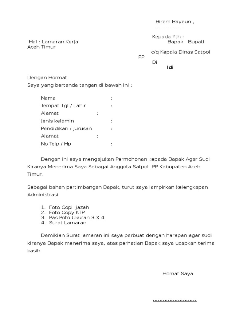 Surat lamaran kerja sebagai honorer pemda contoh surat lamaran kerja sebagai sales tester surat lamaran kerja contoh surat lamaran kerja tulis tangan dinas perhubungan kota batam hering komisi a dengan bkd mengenai surat keputusan pns di. Contoh surat lamaran kerja satpol pp adalah contoh surat lamaran kerja terbaru yang akan admin bagikan kali ini untuk anda khususnya yang memiliki rencana untuk melamar kerja sebagai satuan polisi pamong paraja satpol pp.