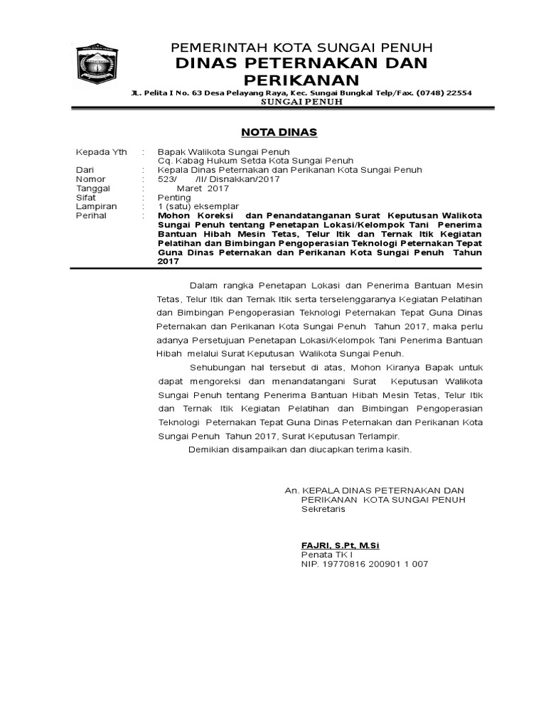Contoh surat nota dinas. Ciri surat ini yang membedakan dengan surat lainnya adalah adanya kop surat dari perusahaan baik pemerintahan atau swasta adannya nomor surat lampiran salam pembuka dan penutup stempel dan tanda tangan perusahaan atau instansi yang. Pengertian tujuan fungsi ciri syarat jenis struktur dan contohnya secara umum surat merupakan suatu sarana komunikasi untuk menyampaikan informasi dalam bentuk tulisan pada kertas oleh satu pihak kepada pihak lainnya baik perorangan maupun organisasi. Surat resmi yang bersangkutan dengan organisasi atau instansi kbbi online. Contoh nota dinas pada instansi pemerintahan untuk perjalanan dinas dan narasumber contoh nota dinas merupakan hal penting yang harus anda ketahui karena nota dinas ini berfungsi untuk menyampaikan informasi secara formal antara pihak satu ke pihak lainnya dalam instansi pemerintahan atau swasta. Dan hal lain pada nota dinas yang membuatnya menjadi penting dibandingkan dengan surat nota lainnya yang lebih canggih adalah nota dinas ini dapat mempunyai sifat hukum misalnya pada suatu intansi pemerintahan ada atasan meminta bawahannya untuk melakukan tugas kerja yang berisfat mendadak nota dinas bisa dijadikan sk sementara sembari menunggu sk dibuat. Namun kali ini kami akan membahas mengenai surat dinas yang dimana dalam hal ini meliputi pengertian surat dinas.