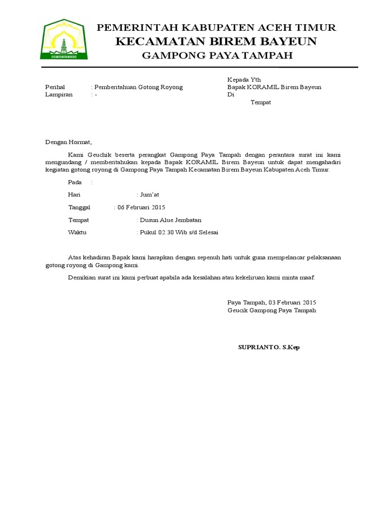 Contoh surat undangan kerja bakti kerja bakti merupakan sebuah kegiatan gotong royong yang di lakukan oleh seluruh warga secara sukarela kegiatan ini biasanya berhubungan dengan kebersihan dan pembangunan guna menciptakan lingkungan yang nyaman selain itu kegiatan kerja bakti dapat memupuk rasa kebersamaan antar warga dalam menjaga lingkungannya. Contoh surat jemputan gotong royong. Persatuanibubapa dan guru sekolah kebangsaan desa petaling desa petaling57100kuala lumpur. 15 contoh surat edaran paling lengkap yang baik dan benar surat merupakan sebuah media komunikasi yang sudah digunakan sejak lama. Salah satu surat resmi yang sering kali kita temui adalah surat undangan kerja bakti dari rt. Sikap gotong royong ini bisa kita temukan di berbagai sisi dan lini kehidupan seperti di sebuah desa rt sampai dengan rw.
