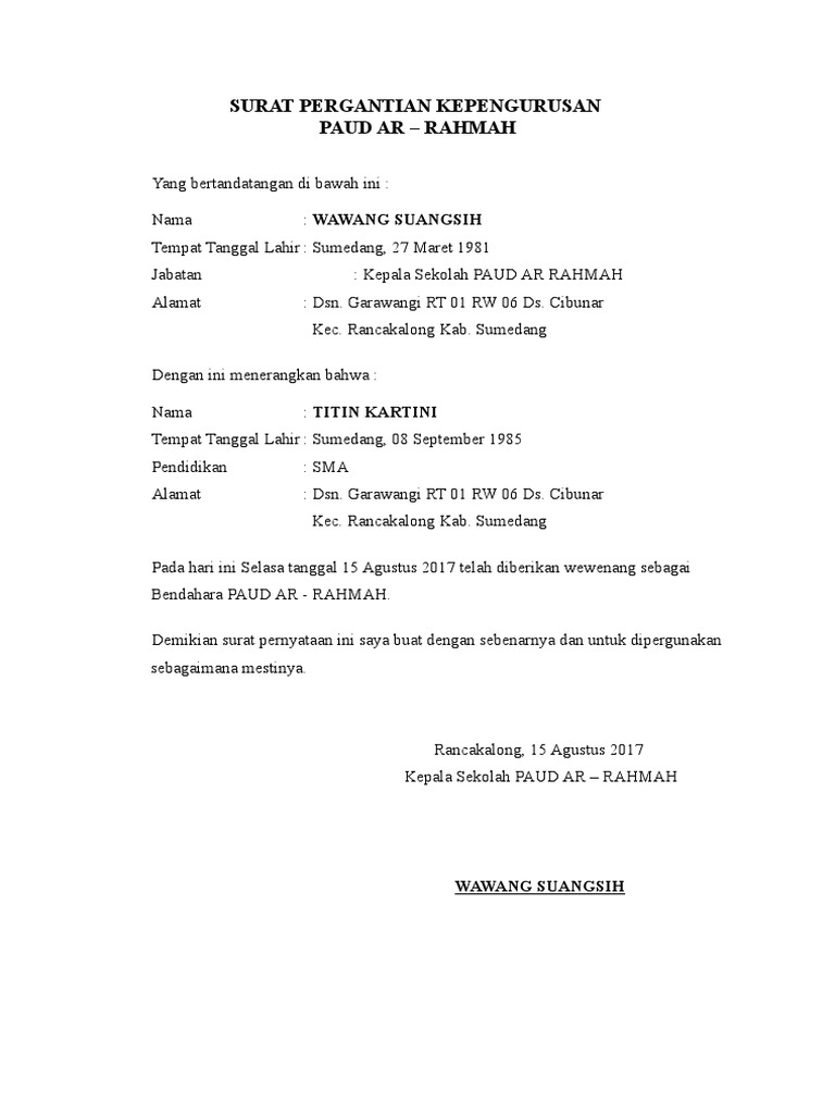 Contoh surat pemberitahuan pergantian jabatan. Surat berikut ini adalah contoh contoh surat pemberitahuan yang dapat di. Namun untuk urusan komunikasi perusahaan maupun berbagai lembaga maupun instansi pemerintah penggunaan surat masih merupakan sesuatu hal yang wajib untuk dilakoni. 15 contoh surat pernyataan paling lengkap untuk berbagai kebutuhan belakangan ini penggunaan surat memang bisa dibilang sudah semakin minim terlebih untuk urusan pribadi. Ada banyak hal yang harus disiapkan saat serah terima jabatan ini salah satunya adalah surat serah terima jabatan. Selain itu surat pemberitahuan juga bisa saja berisi kegiatan. Ketika anda membuat surat ini anda harus memperhatikan tentang kaidah atau aturan aturan di dalam pembuatan surat resmi seperti dengan mencantumkan kop surat tanggal dan lain sebagainya seperti halnya ketika anda membuat contoh surat pemberitahuan dinas sekolah kegiatan kampus dan kegiatan rt paling lengkap atau juga contoh surat pengunduran diri organisasi.