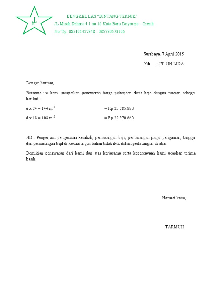 Contoh surat penawaran harga bengkel las. Dalam contoh surat penawaran bengkel gawe cv telah memilihkan tema atau template yang terbaik untuk dijadikan inspirasi ide ataupun acuan dalam penulisan surat anda. Contoh nomor surat resmi contoh surat balasan penawaran harga surat balasan penawaran harga adalah surat yang dibuat oleh pelaksana kegiatan berdasarkan surat penawaran harga yang diajukan oleh penyedia barangjasa yang memuat balasan tentang perlu tidaknya dilakukan negosiasi dan klarifikasi harga. Free contoh surat penawaran jasa bengkel las 99 dalam proses mendesain dokumen penting di contoh surat penawaran jasa bengkel las. Contoh surat penawaran harga bengkel las surat pengikut. Contoh surat penawaran bengkel gawe cv may 12 2019 contoh surat anda sedang membuka postingan contoh surat penawaran bengkel yang berada pada kategori contoh surat dengan tag postingan berikut contoh surat penawaran bengkel contoh surat penawaran bengkel las contoh surat penawaran bengkel motor contoh surat penawaran harga bengkel las contoh surat penawaran jasa bengkel mobil.