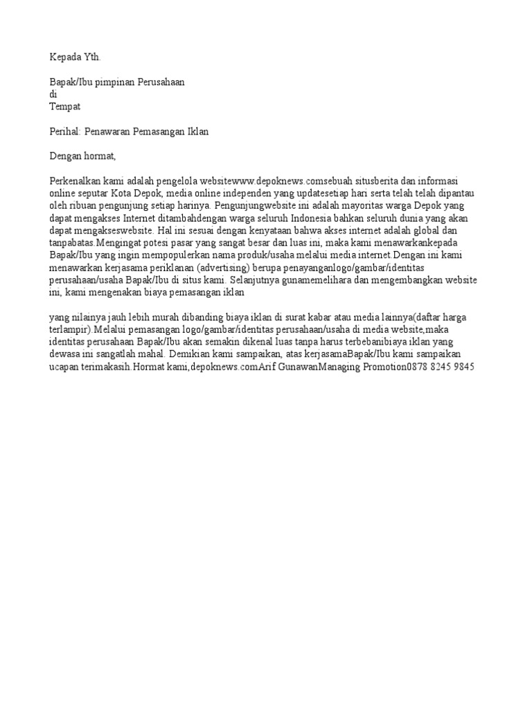 Contoh surat penawaran iklan media online. Alamat tukang pijat. Media online independen yang update. Kop suratlogo perusahaan media no. Penawaran kerjasama penyebarluasan informasi kegiatan pemerintah provinsi sulawesi utara. Contoh surat dagang surat penawaran hal. Proposal penawaran iklan source.
