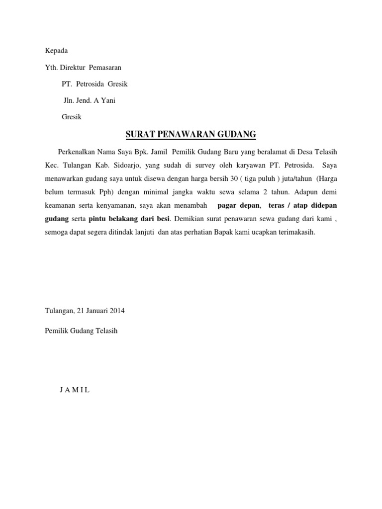 Contoh surat penawaran sewa gudang. Jenis surat ini tergolong masih merupakan salah satu jenis surat yang masih relevan untuk digunakan pada saat sekarang ini. Surat penawaran sewa gudang bersama surat ini kami menawarkan gudang untuk di sewakontrak di jl raya circas jakarta timur sebagai berikut. Contoh surat permohonan tempat usaha perdagangan setiap usaha yang legal haruslah memiliki surat izin perdagangan yang disahkan dilegalkan oleh pemerintah setempat. 2100m2 luas gudang. Berikut ini adalah beberapa informasi yang terkandung di dalam surat perjanjian sewa gudang yang perlu kita ketahui. Surat itu bermaksud meminta kepada penjual agar memberikan penawaran sacara resmi.
