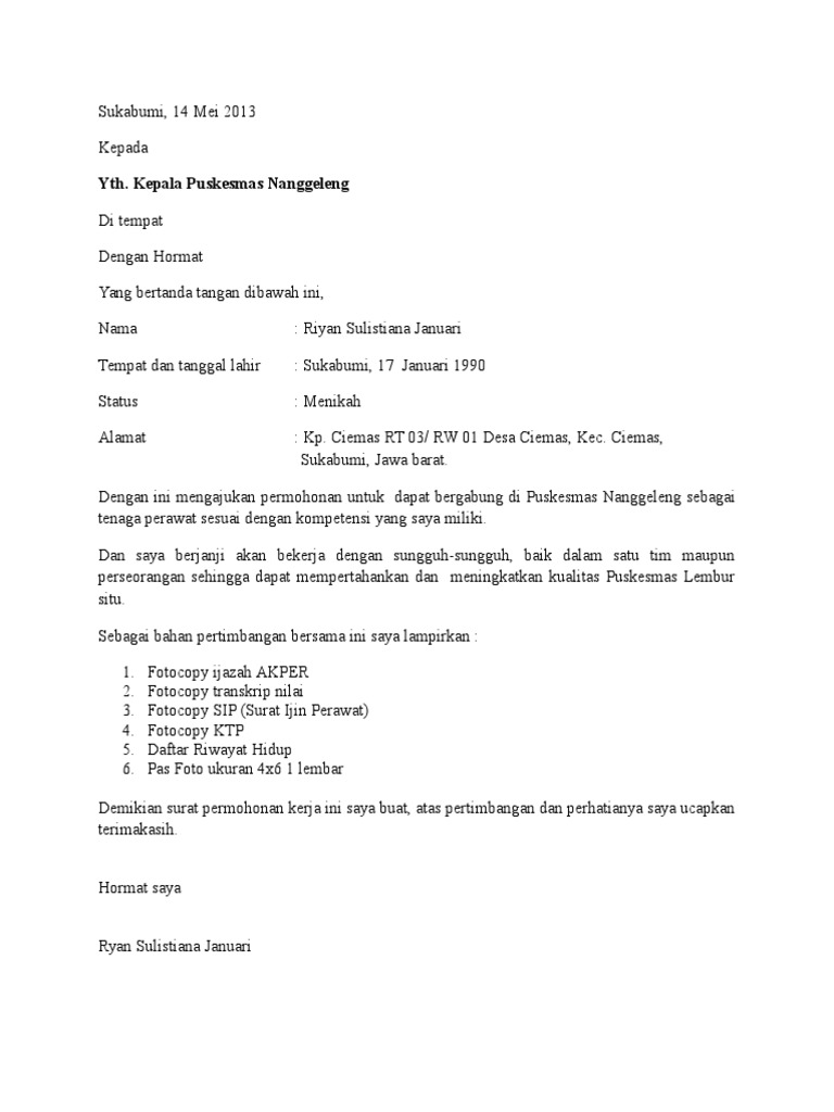 Contoh surat pengalaman kerja perawat di puskesmas. Contoh surat magang perawat di puskesmas in addition it will include a picture of a kind that could be seen in the gallery of contoh surat magang perawat di puskesmas. Khususnya bagi anda yang ingin melamar kerja sebagai perawat di rumah sakit puskesmas klinik baik bagi anda yang sudah berpengalaman kerja sebagai perawat sebelumnya ataupun bagi anda lulusan baru atau fresh graduate. Jadi jika anda ingin mencari pekerjaan di tempat yang lebih tinggi dari sekarang ini jangan pernah lupa untuk meminta surat keterangan pengalaman kerja dari atasan anda. Informasi yang anda cari adalah contoh surat pengalaman kerja perawat di puskesmasdibawah ini telah kami sajikan informasi lowongan kerja lulusan sma smk d3 s1 s2 semua jurusan lowongan bank bumn cpns dan swasta lainnya berdasarkan keterkaitan artikel ataupun keterkaitan iklan yang benar benar sesuai dengan kata kunci. Bagi anda lulusan lulusan baru fresh graduate yang sudah bergelar d3 ataupun s1 keperawatan sangat penting untuk anda tahu bagaimana cara membuat surat lamaran kerja perawat yang baik dan benar sebelum anda melamar pekerjaan sebagai perawat di rumah sakit puskesmas ataupun di klinik yang sedang membuka lowongan. Contoh surat lamaran kerja perawat.