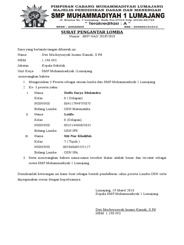 4213 104 smp. Contoh surat permohonan pengesahan dan berita acara relawan tik. Format surat pengantar lomba. Di saat sekolah mendapatkan undangan untuk mengikuti lomba olimpiade atau turnamen lainnya. Mengetahui wassalamualaikum wrwb ketua forum bidik misi itb. Buat agan yang bingung contoh surat keterangan untuk mengikuti lomba nih gantinggal copas aja.