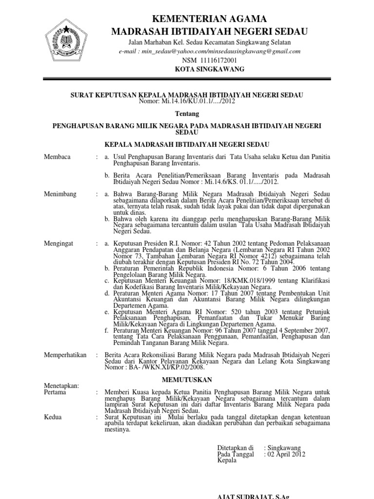 Contoh surat penghapusan barang. Kritik dan saran sangat saya tunggu demi perbaikan blog ini dimasa yang akan datang. Dengan hormat bersama ini kami sampaikan bahwa dalam rangka tertib administrasi pengelolaan barang milik daerah berdasarkan peraturan menteri dalam negeri nomor 19 tahun 2016 tentang pedoman pengelolaan barang milik daerah bahwa perhapusan barang. Ketentuan umum 21 pelaksanaan pelayanan 211 penghapusan barang milik negara bmn. Kritik dan saran saya harapkan demi kemajuan blog ini kedepannya. Semoga contoh surat permohonan penghapusan barang inventaris kantor sekolah 2017 ini dapat menjadi referensi yang baik untuk anda yang membutuhkannya. Mungkin barang tersebut masih ada harapan hidup dalam arti barang tersebut.
