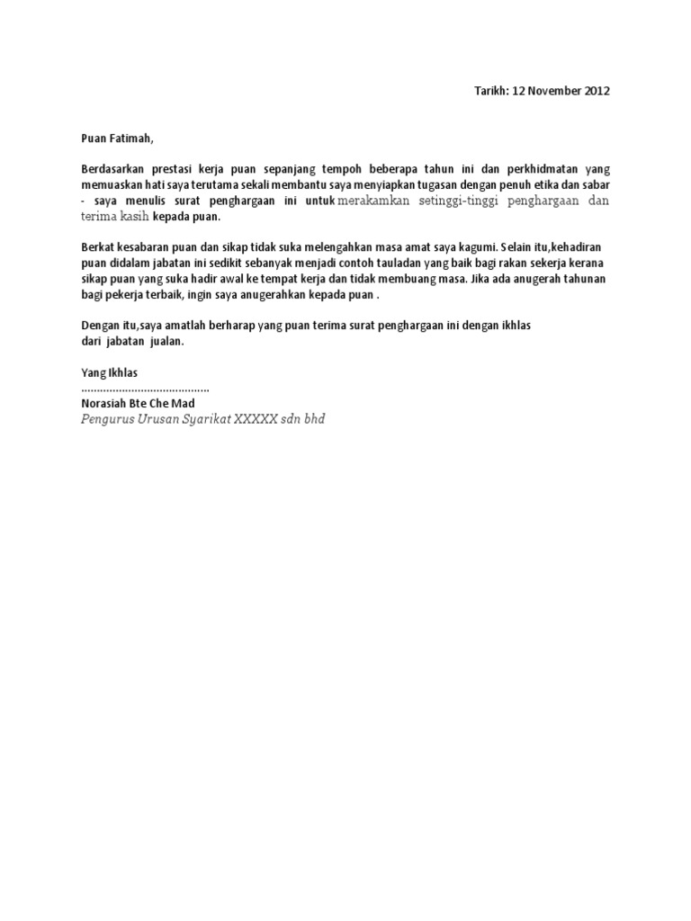 Adapun pengertian dari penghargaan dalam perusahaan kerap dalam bentuk pemberian berupa piagam dan sejumlah uang dari perusahaan pegawai yang mempunyai prestasi. Ada juga perusahaan yang memberikan penghargaan kepada pegawai karena masa kerja dan pengabdiannya dapat dijadikan teladan bagi pegawai lainnya. Syukur ke hadrat ilahi kerana dengan limpah kurnianya setelah bertungkus lumus dapat saya menyiapkan tugasan berkumpulan pengenalan hubungan antarabangsa ini dalam jangka masa yang telah ditetapkan. Penulisan keterangan pribadi seperti nama alamat nomor telepon yang dapat dihubungi email dan lain lain. Surat apresiasi bertujuan untuk meningkatkan motivasi bagi karyawan di lingkungan tempat kerja untuk mampu melaksanakan pekerjaan yang dapat memberikan dampak positif bagi kemajuan. Surat apresiasi karyawan merupakan surat resmi yang dikeluarkan oleh sebuah perusahaanlembagainstansi untuk memberikan penghargaan secara tertulis bagi karyawan yang telah menunjukkan prestasi kinerja yang baik.