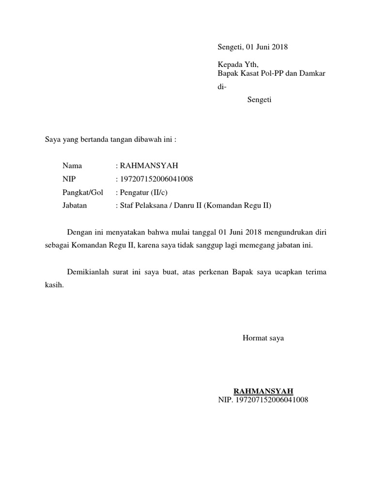 Mengundurkan diri adalah sesuatu yang wajar dilakukan oleh siapaun yang berada dalam sebuah tanggung jawab perusahaan organisasi atau instansi lainnya. Contoh surat contoh surat lamaran yang baik 2016. Contoh surat pengunduran diri anggota polri sebagai bareskrim dapat kamu unduh secara lengkap dan gratis pada link di bawah ini contoh surat pengunduran diri anggota polri download contoh surat pengunduran diri anggota polri sebagai bareskrim surat pengunduran diri anggota polri. Contoh diatas adalah surat pengunduran diri anggota polri kepolisian negara republik indonesiasurat resmi tersebut bisa anda sesuaikan dengan data diri. Contoh surat permohonan cerai anggota polri. Contoh surat contoh surat lamaran kerja bahasa inggris yang sederhana.