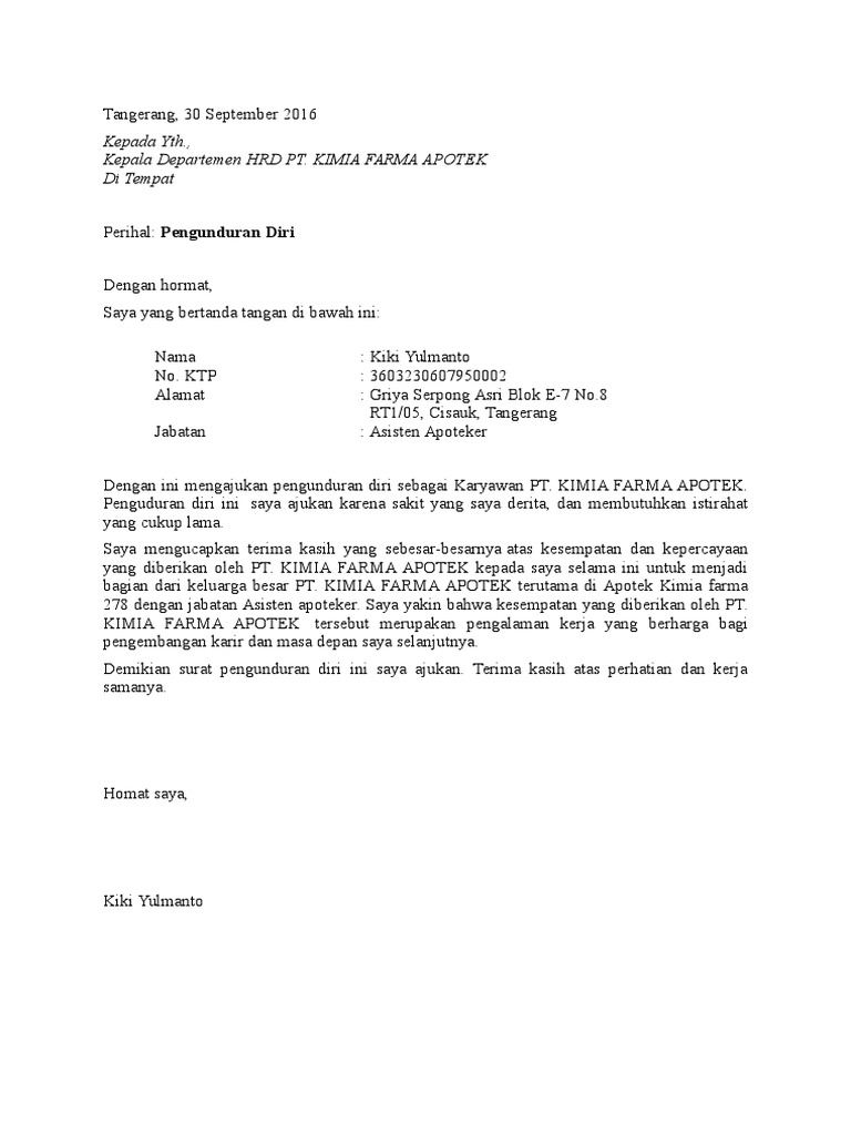 Contoh surat pengunduran diri berikut ini 3 contoh surat untuk pengunduran diri karyawan perusahaan dalam format sederhana tapi bisa digunakan secara resmi. Kadang demi profesionalisme perusahaan atau rumah sakit yang bertaraf internasional kita dituntut untuk memahasi bahasa inggris walaupun secara pasif walaupun pada kenyataanya nanti pas sudah diterima bekerja sebagai apoteker komunikasi. Contoh surat pengunduran diri dari perusahaan terkadang memang dibutuhkan. Kulon progo 28 september 2017. Contoh surat pengunduran diri adalah jenis surat yang banyak diperlukan saat ini baik di kantor ia bekerja maupun di sekolah sekolah juga organisasi tempat dia berkecimpung selama ini biasanya surat ini dibuat ketika akan mengembangkan kemampuan dan ilmunya di tempat lain atau juga bisa jadi karena sudah tidak cocok dengan tempatnya yang sekarang dan ingin mencari suasana baru. Rabiah al adawiah ssi apt.