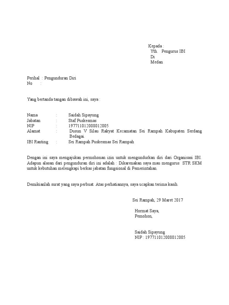 Melalui surat ini saya akan menyampaikan maksud dari pengunduran diri saya sebagai kepala humas di lsm anak muda peduli makassar karena harus melanjutkan kuliah di luar negeri terhitung mulai tanggal 30 juni 2018. Contoh surat pengunduran diri hallo sobat sharingsetelah beberapa waktu lalu saya bahas soal contoh surat lamaran kerja kali ini saya akan sharing tentang contoh surat pengunduran diri contoh surat resign. Setelah sebelumnya saya membahas tentang contoh surat lamaran kerja kali ini saya akan membahas contoh surat pengunduran diri yang baik dan benar. Contoh surat pengunduran diri atau contoh surat resign yang baik dan benar. Khususnya bagi anda yang ingin melamar kerja sebagai perawat di rumah sakit puskesmas klinik baik bagi anda yang sudah berpengalaman kerja sebagai perawat sebelumnya ataupun bagi anda lulusan baru atau fresh graduate. Itulah contoh surat pengunduran diri kerja di puskesmas yang dapat admin kumpulkan.