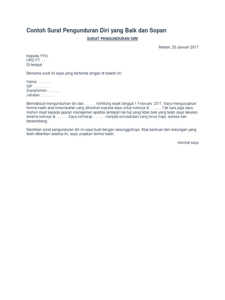 Contoh surat pengunduran diri kerja yang baik dan sopan pdf. Cara mengajukan surat pengunduran diri. 17 contoh surat pengunduran diri resmi yang baik dan sopan banyak hal bisa saja terjadi di tempat kerja yang membuat kita tidak lagi nyaman dengan lingkungan tempat kita bekerja. Mengundurkan diri adalah sesuatu yang wajar dilakukan oleh siapaun yang berada dalam sebuah tanggung jawab perusahaan organisasi atau instansi lainnya. Berikut contoh surat pengunduran diri yang baik dan sopan yang bisa kamu jadikan referensi. Mengungkapkan alasan pengunduran diri dalam menyusun surat pengunduran diri kerja yang baik dan sopan salah satu poin terpentingnya adalah mengungkapkan secara jelas alasan mengapa kita ingin mengundurkan diri dari perusahaan tersebut. Sebaliknya anda akan dianggap sebagai karyawan yang memegang teguh profesionalisme.