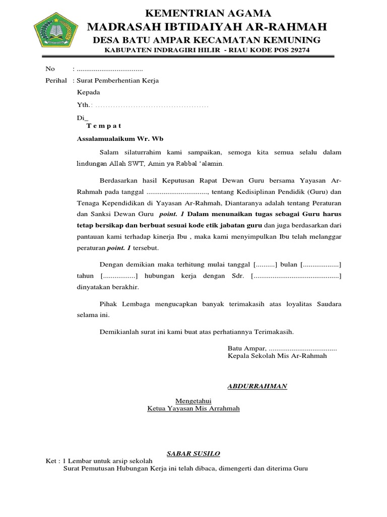 Contoh surat pengunduran diri sebagai guru paud. Sehingga terkadang akan membuat guru tersebut merasa sudah tidak mampu lagi untuk menjadi seorang guru dan memilih untuk mengundurkan diri. Kami menyajikan informasi terkait surat pengunduran diri guru paud. Beberapa waktu yang lalu saya juga sudah menuliskan contoh surat lamaran kerja di bank yang baik dan benar. Yuk simak berbagai contoh format surat pengunduran diri yang berprofesi sebagai guru. Anda juga harus menyampaikan surat pengunduran diri kepada kepala. Surat ini bisa diberikan kepada kepala sekolah atau dinas terkait bisa juga kepada kepala yayasan untuk sekolah swasta.