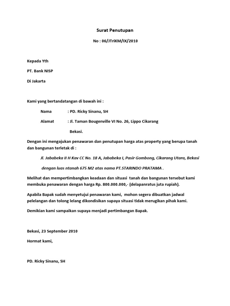 Contoh surat penutupan harga. Contoh surat niaga penawaran tanah bisnis property sebetulnya tidak dulu ada matinya. Salah satunya adalah surat penutupan perusahaan untuk pajak. Contoh surat penawaran surat penawaran yaitu surat yang ditulis guna menyampaikan maksud suatu perusahaan untuk menjalin kerjasama dengan perusahaan lainnya. Surat pemberitahuan ini biasanya berisi tentang informasi yang ingin disampaikan atau berbentuk pengumuman. Surat minat dan penutupan harga sehubungan dengan informasi yang dapat dipercaya yaitu masalah penyediaan valas korut tertanggal 15 september 2016 bersama ini kami dari pihak tim buyer sangat berminat untuk melaksanakan transaksi tukar menukar valas korut dengan idr dan akan kami tutup dengan harga rp. Contoh surat penutupan perusahaan untuk pajak.