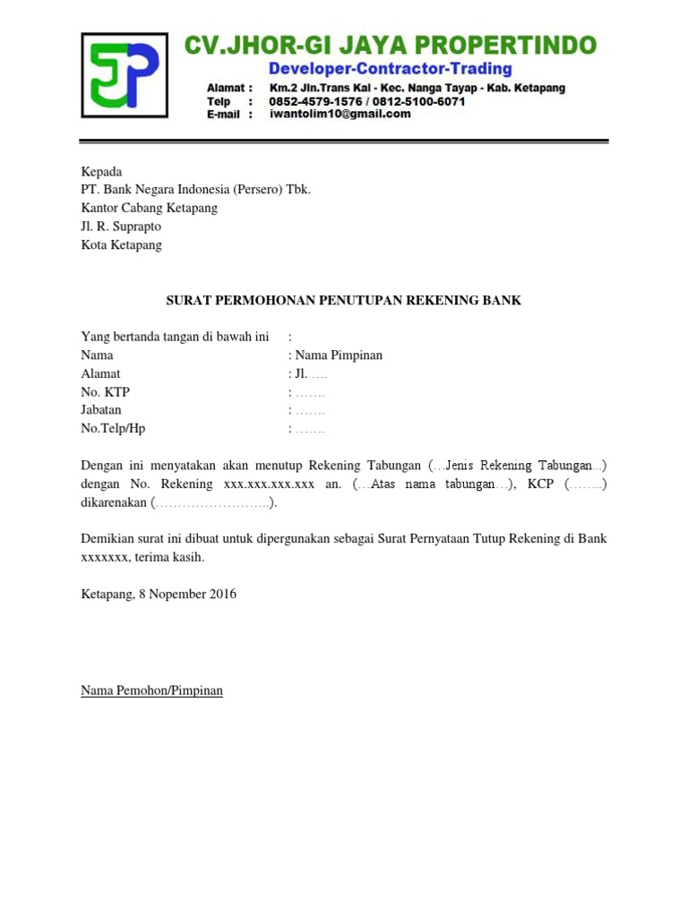 Perusahaan dapat melakukan penutupan rekening bank untuk tujuan dan alasan tertentu seperti perusahaan. Contoh surat kuasa bank dalam dunia perbankan surat kuasa bukanlah sesuatu hal yang jarang.
