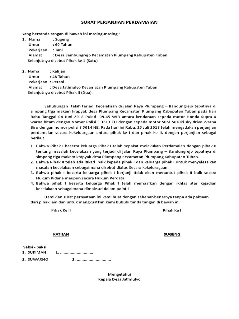 Contoh surat perdamaian kecelakaan. Contoh surat perjanjian perdamaian dari sekian banyaknya surat salah satu yang paling penting yaitu surat yang digunakan untuk melakukan perjanjian damai. Contohsuratid surat perdamaian perjanjian perdamaian kecelakaan. Saat berkendara harus fokus dan tidak boleh lalai. Contoh surat perjanjian perdamaian kecelakaan meninggal dunia on mar 18 2018 0 siapapun orangnya tentu tidak menginginkan terjadinya kecelakaan kami doakan semoga kita semua terhindar dari peristiwa ini. Academiaedu is a platform for academics to share research papers. Dalam suatu masalah yang misalnya dalam perbuatan asusila ataupun masalah kecelakaan dijalan maka di saat kedua belah pihak tidak ingin melanjutkan ke dalam pengadilan alias damai dan diselesaikan secara kekeluargaan maka sebaiknya dibuat juga sebuah surat perjanjian damai agar tidak terjadi kesimpang siuran dan tuntutan.