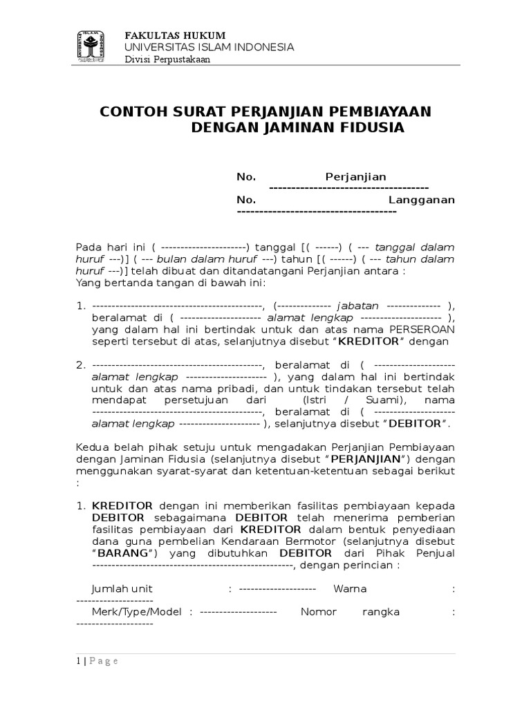 Contoh surat perjanjian fidusia. Saat ini banyak lembaga pembiayaan melakukan eksekusi pada objek barang yang dibebani jaminan fidusia yang tidak didaftarkan. Jaminan tersebut kedudukannya masih dalam penguasaan pemilik jaminan. Kedua belah pihak setuju untuk mengadakan perjanjian pembiayaan dengan jaminan fidusia selanjutnya disebut perjanjian dengan menggunakan syarat syarat dan ketentuan ketentuan sebagai berikut. Contoh surat perjanjian hutang piutang ketika kita melakukan kegiatan hutang piutang pasti akan membutuhkan sebuah contoh surat perjanjian hutang piutang yang benar sebagai acuan sehingga tidak terjadi hal hal yang bisa merugikan antara kedua belah pihak. 42 tahun 1999 tentang jaminan fidusia karena tidak syah atau legalnya perjanjian jaminan fidusia yang dibuat. Perjanjian fidusia adalah perjanjian hutang piutang kreditor kepada debitor yang melibatkan penjaminan.