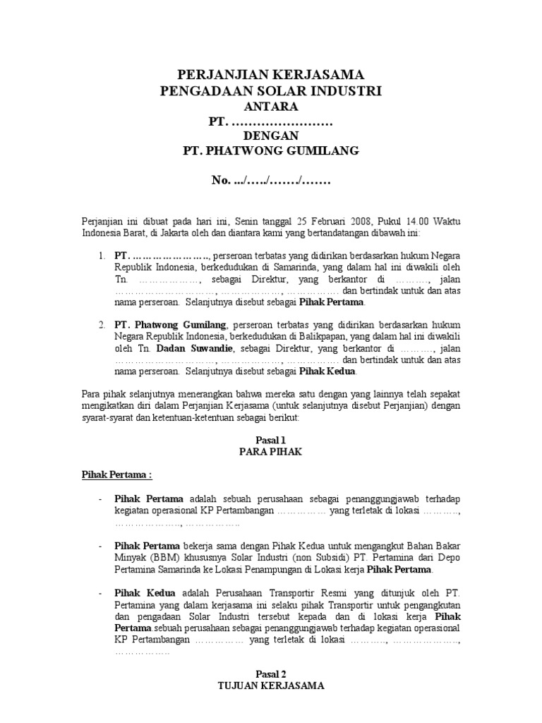 0 0 w a k t u indonesia barat di jakarta oleh dan diantara kami yang bertandatangan dibawah ini. Contoh surat perjanjian kerjasama ada sangat banyak jenis kerjasama yang mudah kita temukan sekarang ini. Perjanjian kerjasamapengadaan solar industri antarapt. Penawaran suatu barang jasa bahkan kerjasama dengan pihak lain akan lebih baik jika menggunakan surat penawaran. Tujuan kerjasama ini adalah mendukung kegiatan operasional kerja dalam hal ini pengadaan bahan bakar minya solar industri secara berkesinambungan dangan tanpa ada ketidak sesuaian secara kuantitas dan kualitas serta ketepatan waktu pengiriman yang dapat menghabat dan merugikan masing masing pihak. 5 contoh mou kerjasama perusahaan perjanjian kerja perjanjian memang sangat diperlukan untuk mengetahui apa saja hal hal yang membatasi kedua belah pihak yang berjanji dan salah satu cara untuk mengetahui hal tersebut adalah dengan membuat contoh mou kerjasama karena di dalamnya akan menjelaskan apa saja poin poin kesepakatan yang dibuat.