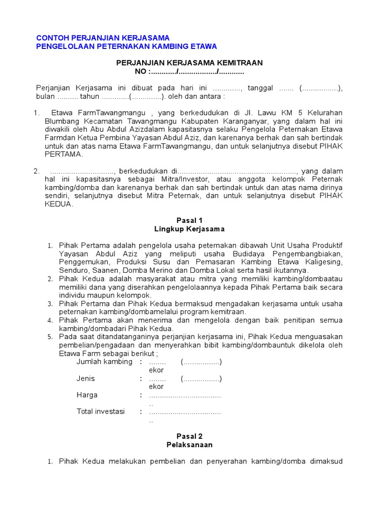Contoh surat perjanjian kerjasama usaha peternakan. Pasal 2 pihak kedua memberikan keuntungan dari penjualan sebesar 5 atau rp. Dengan contoh pembelian rp600000. 15 contoh surat perjanjian kerjasama berbagai bidang sebagai suatu perusahaan yang ingin cepat berkembang maka tentu sebuah perusahaan tidak bisa berdiri sendiri tanpa ikatan dengan perusahaan lain. Sebuah surat perjanjian usaha yang baik setidaknya harus memuat elemen elemen berikut. 0811 56 1982 surat perjanjian kerjasama usahadalam menjalankan sebuah usaha bersama haruslah terdapat perjanjian resmi hitam putih diatas materai yang ditandatangani oleh kedua belah pihak. Mungkin hanya itu saja untuk contoh surat perjanjian kerjasama usaha secara lengkap yg sekiranya kami dapat sajikan kpd anda pada kesempatan hari ini semoga saja dari contoh surat perjanjian kerjasama yg baru saja kami bahas diatas tadi itu dpt membantu anda anda sekalian.