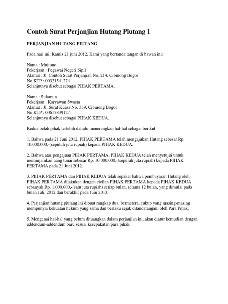 Surat perjanjian ini bertujuan untuk mengingatkan antara kedua belah pihak atau lebih untuk melakukan sesuatu hal. Perjanjian pun bisa dibuat dengan cara lisan dan cara tertulis. Contoh surat perjanjian dalam dunia bisnis pasti tidak jauh dengan yang namanya surat perjanjian. Contoh surat perjanjian hutang piutang persoalan utang piutang bukanlah hal yang asing dalam kehidupan kita sehari hari. 15 contoh surat perjanjian hutang yang benar dan terlengkap sebuah perjanjian merupakan kesepakatan yang dibuat oleh dua orang atau dua pihak mengenai sesuatu hal tertentu. Contoh surat penagihan hutang pemberitahuan tunggakan perusahaan ketika seseorang atau perusahaan melakukan pinjaman dana kepada pihak lain maka akan dibuat suatu perjanjian mengenai pembayaran atau pengembalian pinjaman tersebut.
