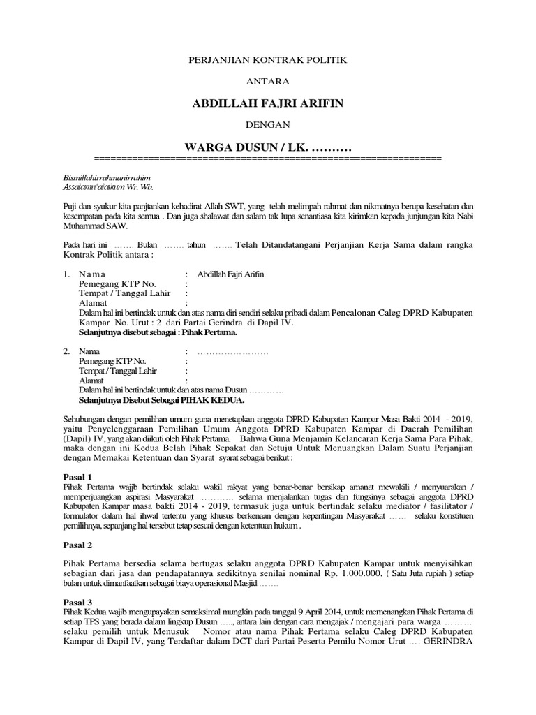 Telah ditandatangani perjanjian dalam rangka kontrak politik calon kepala desa makasari masa bakti 2013 2019 sehubungan dengan pemilihan kepala desa makasari masa bakti 2013. Apabila dikemudian hari terjadi ketidaksepahaman dan atau terdapat hal hal lain yang belum terdapat dalam surat perjanjian ini maka akan diselesaikan secara musyawarah. Contoh surat resmi himpaudi pendidikan 1. Surat perjanjian kerjasama merupakan salah satu jenis surat resmi yang mengikat untuk pembagian atas hasil usaha yang dibiayai dengan kredit atau pembiayaan antara kedua belah pihak yang bersangkutan demi tercapainya kesepakatan yang jelas di awal terbentuknya perjanjian usaha. Surat perjanjian ini meliputi banyak hal dan bidang dan juga sering dipergunakan oleh banyak pihak. Cerita silat jawa.