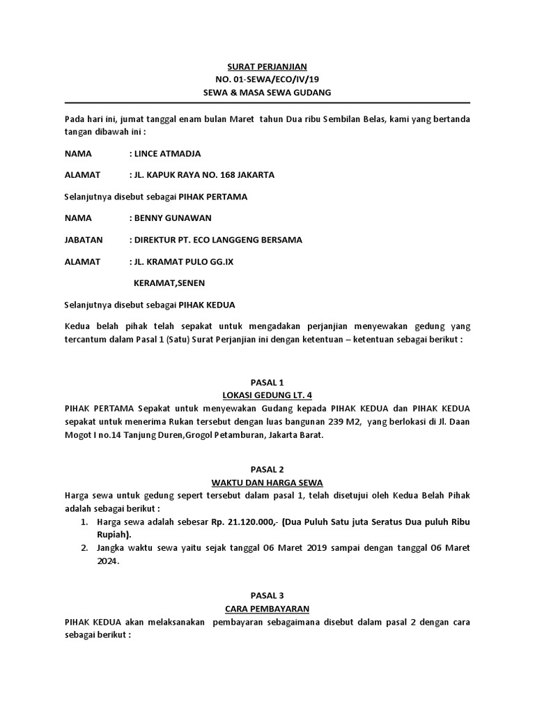 Demikianlah surat perjanjian sewa gudang ini dibuat dan ditandatangani oleh pihak pertama dan pihak kedua di suka maju pada hari sabtu tanggal delapan belas bulan empat tahun dua ribu dua puluh dalam keadaan sadar tanpa adanya paksaan atau tekanan dari pihak manapun. Rumah toko ruko yang bertanda tangan di bawah ini. Surat yang berisi kesepakatan inilah yang kemudian diberi nama surat perjanjian. Contoh surat perjanjian sewa menyewa perjanjian sewa menyewa. Surat perjanjian sewa gudang pada hari ini tanggal bulan tahun dua ribu tigabelas 2013 kami yang bertandatangan di bawah ini. Meskipun ada banyak contoh yang bisa dilihat di internet kita tidak tahu mana yang dapat dikategorikan sebagai surat penjanjian yang baik dan benar.