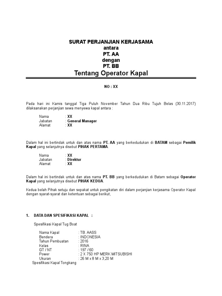 Untuk anda yang ingin mengontrak rumah atau malah mungkin yang mengontrakkan yg punya rumah sebaiknya gunakan contoh surat perjanjian kontrak rumah atau sewa rumah ini sebagai bagian dari kesepakatan kontrak atau sewa rumah. Selain surat perjanjian penyewaan mobil surat kerjasama mengenai sewa menyewa kendaraan lainnya yang perlu untuk di pertegas adalah surat yang berisi kesepakatan mengenai sewa alat berat. Perjanjian antar dua pihak ini biasa dikenal dengan istilah memorandum of understanding mou. Great contoh surat perjanjian freight charter kapal 61 guna ide membuat surat perjanjian oleh post contoh surat perjanjian freight charter kapal semoga dengan gawe cv post beberapa contoh dapat menjadikan anda lebih baik lagi dalam berkreasi serta menulis surat yang baik dan menarik. Dalam contoh surat penawaran kapal gawe cv telah memilihkan tema atau template yang terbaik untuk dijadikan inspirasi ide ataupun acuan dalam penulisan surat anda. Dengan ketentuan menunjuk pada semua syarat syarat dan ketentuan pada perjanjian ini pihak kedua penyewa setuju untuk menyewa tug boat dari pihak pertama pemilik kapal dan pihak pertama setuju untuk memberikan sewa kepada pihak kedua dengan sistem time charter di mana tug boat dan barge tongkang akan diberikan oleh pihak.