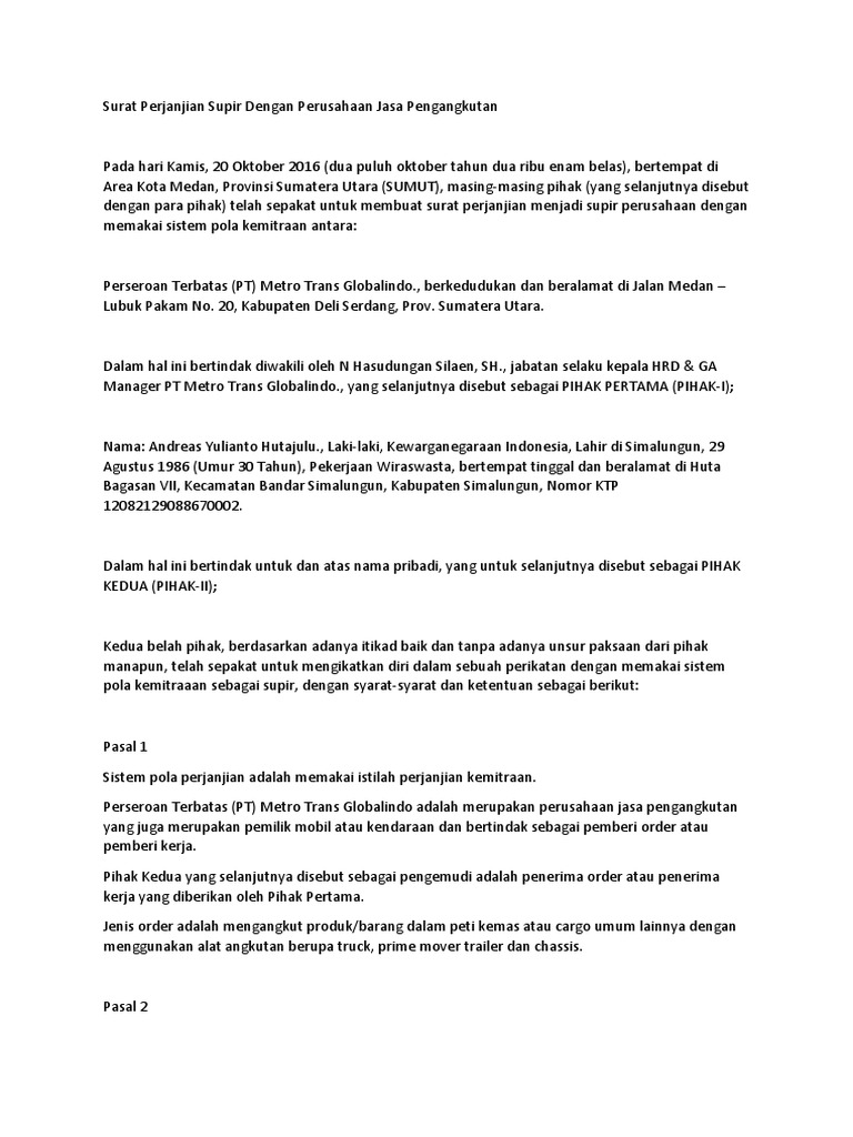 Contoh surat perjanjian sopir dengan perusahaan. Rincian data diri yang diperlukan antara lain nama karyawan nama perusahaan dan alamat perusahaan. Contoh surat kontrak kerja surat kontrak kerja adalah salah satu dokumen penting yang dimiliki oleh seorang karyawan pegawai di sebuah perusahaan. Surat perjanjian kontrak kerja semua perusahaan pada dasarnya sama karena di indonesia sendiri segala sesuatu yang berhubungan dengan tenaga kerja dan karyawan sudah diatur dalam undang undang agar dapat menjamin setiap orang dapat mendapatkan hak nya masing masing. Selanjutnya mari kita bahas apa saja bagian bagian. Perjanjian antar dua pihak ini biasa dikenal dengan istilah memorandum of understanding mou. Contoh surat perjanjian kerja pada aktifitas kerja terdapat surat perjanjian yang digunakan untuk membuat kesepakatan antar pihak pihak yang terlibat dalam kerjasama.