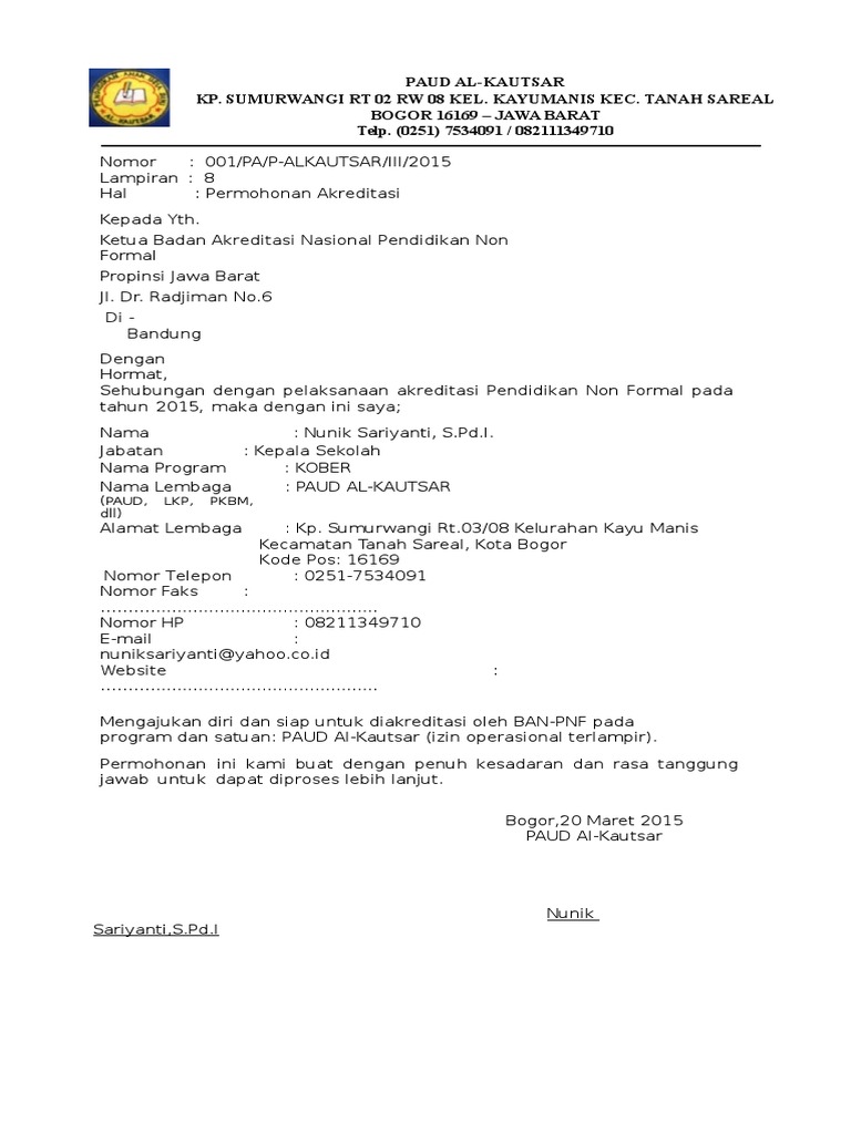 Contoh surat permohonan akreditasi paud. Pengertian surat keterangan pindah sekolah adalah surat keterangan yang dikeluarkan oleh kepala sekolah atas dasar surat permohonan pindah sekolah dari orang tua atau wali murid yang menerangkan tentang kepindahan sang anak. Contoh format surat permohonan akreditasi sekolah paudtk dikmas ban pnf. Contoh surat permohonan akreditasi paud download pedoman atau panduan penyusunan proposal permohonan akreditasi paud tk raba kb tpa sps dan contoh proposal akreditasi paud dalam format doc yang dapat di edit untuk keperluan akreditasi sekolah paud ayah bunda semua. Mulai hari ini tanggal 02 april 2019 aplikasi akreditasi paud dan pnf sispena 20 sudah bisa di akses. Berikut contoh format terbaru surat permohonan akreditasi ban pnf untuk p aud lkp pkbm dll. Pada tahun 2016 ini sekolah paud dikmas telah di buka untuk pendaftaran atau permohonan untuk mengikuti akreditasi sekolah paud.