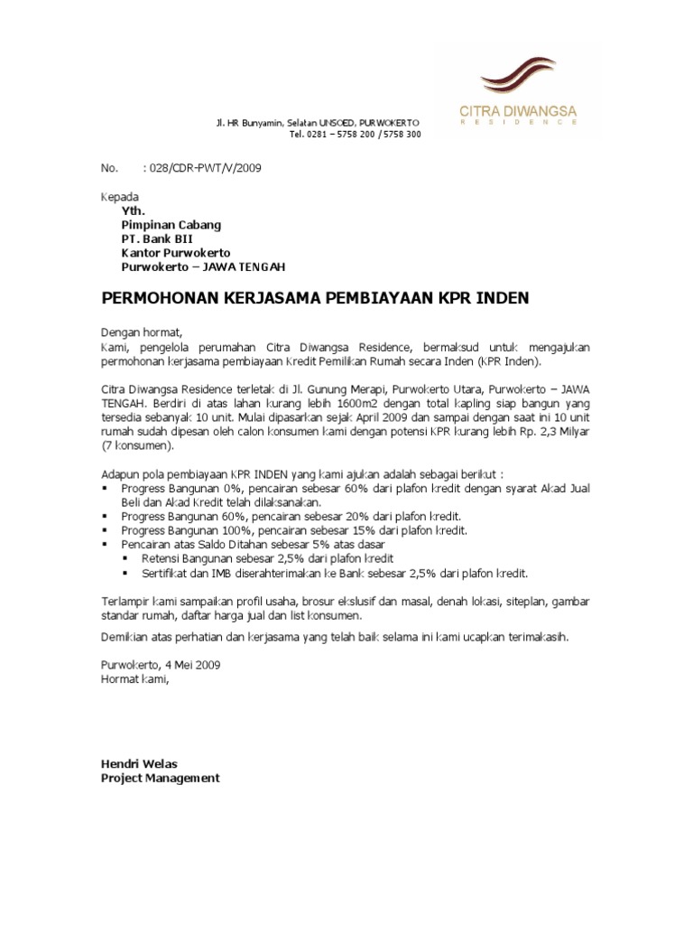 Contoh Surat Permohonan Kerjasama Kredit Perumahan Rakyat