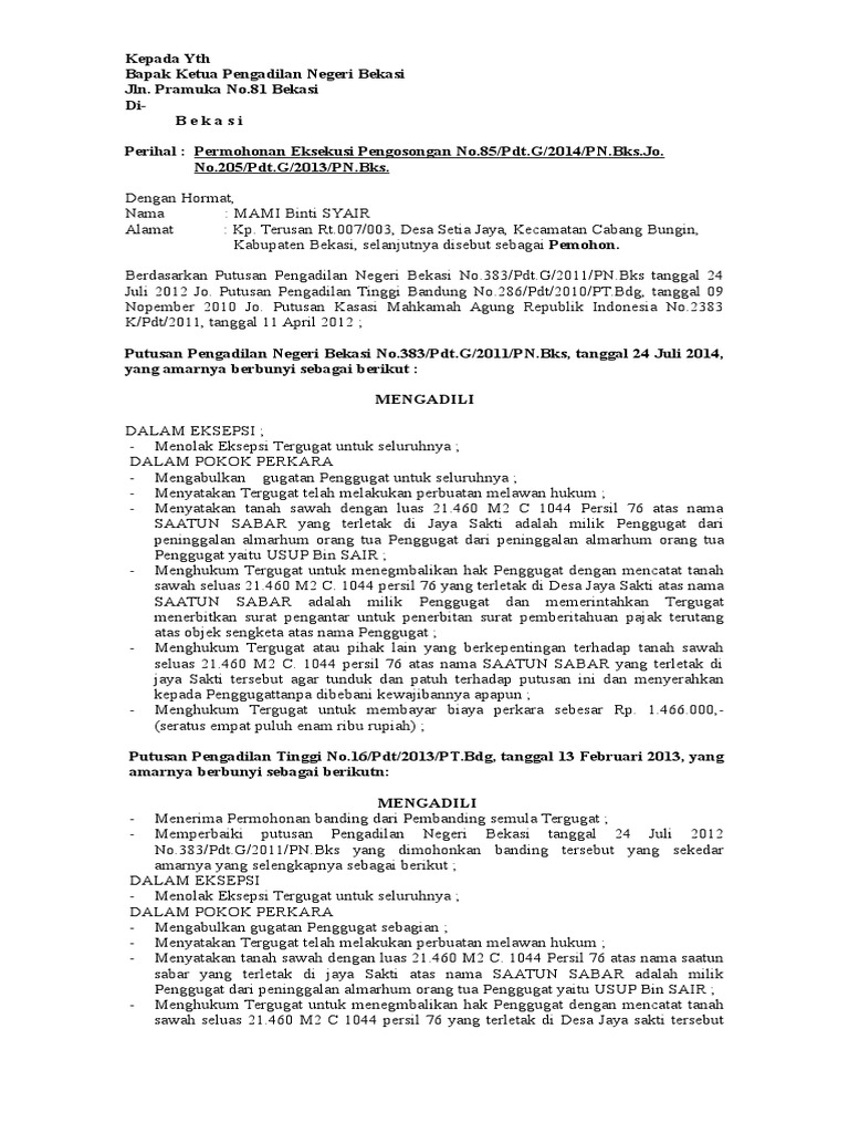 Untuk ini kami bermohon bapak ketua pengadilan negeri depok melaksanakan eksekusi terhadap putusan no. Contoh surat permohonan eksekusi pengosongan contoh permohonan eksekusi atas putusan perkara perdata kota tangerang selatan 17 juli 2014 kepada yth.