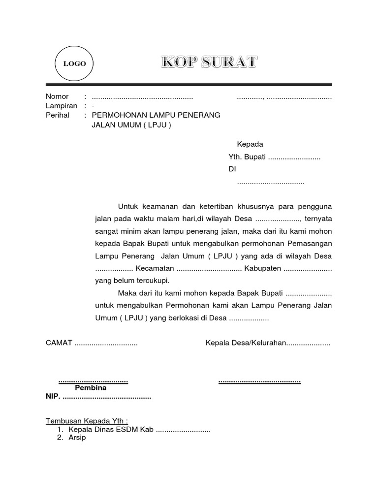 Ada juga yang melibatkan pengiriman dan pengambilan barang kembali. Contoh surat permohonan pindah tugas pns doc 2. Admin blog kumpulan surat penting juga mengumpulkan gambar gambar lainnya terkait contoh surat permohonan lampu penerangan jalan umum dibawah ini. Surat permohonan lampu penerang jalan lpju adalah surat yang dikeluarkan dari desakelurahan surat ini dikeluarkan untuk mengajukan permohonanpermintaan kepada pemerintah terkait dalam hal ini yaitu dinas esdm untuk memberikan bantuan berupa lampu penerang jalan umum untuk meyakinkan harap di lampiri peta lokasi titik pemasangan lpju. Dipermaklumkan dengan hormat bahwa kami atas nama pengurus pondok pesantren miftahul huda 3 dengan ini kami mengajukan permohonan perbaikan reparasi lampu penerangan jalan di lingkungan pondok pesantren miftahul huda 3 karena saat ini lampu penerangan jalan umum sudah tidak berfungsi sehingga aspek keamanan pun berkurang. Untuk itu kami mohon di lokasi tersebut agar di pasang sebuah lampu mercury dengan kapasitas 1000 watt.