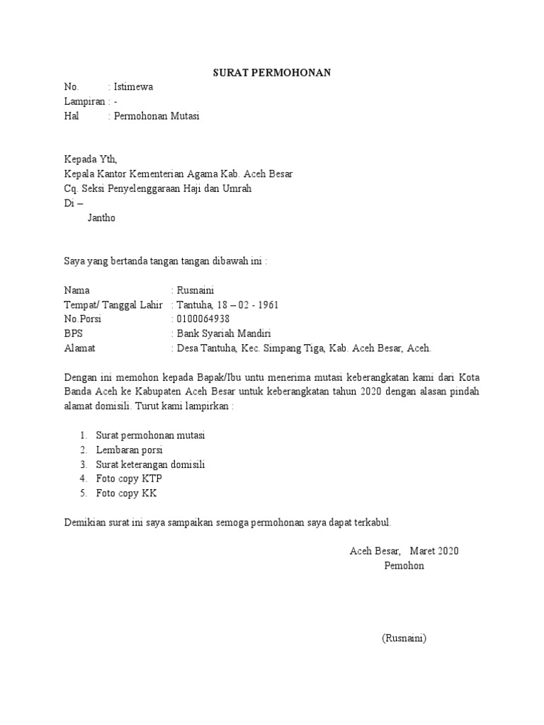 Contoh surat permohonan mutasi haji. Contoh surat permohonan mutasi haji. Peraturan kepala kepolisian negara republik indonesia nomor 7 tahun. Sejak anda mendaftar sebagai peserta haji dibutuhkan waktu untuk keberangkatan nantinya. Inilah pembahasan selengkapnya mengenai contoh surat permohonan penggabungan haji suami istri. Tidak menutup kemungkinan jika selama menunggu tersebut anda pindah tugas atau pindah domisili. Untuk mempermudah urusan anda pun bisa mengajukan surat permohonan mutasi haji kepda pihak berwenang.