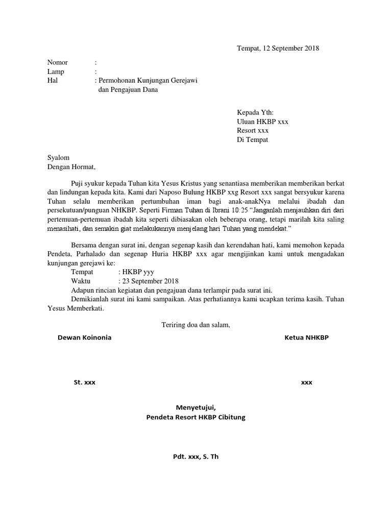 Contoh surat permohonan pelayanan di gereja. Dalam rangka menata layani perkembangan dan pelayanan dari amgpm ranting v kedepan biro pemuda gereja pentakosta indonesia jabodetabek sektor iii. Contoh proposal permohonan bantuan dana pembangunan gerejasegala puji bagi allah yang mahakuasa di dalam anak nya yesus kristus tuhan kita yang selalu membimbing dan memfasilitasi panitia pelatihan gereja hkbp para pemukim bandar ressort kedatangan bandar sejak terpilihnya komite sampai awal proposal untuk pembentukan dari gereja hematografi pematang bandarhkbp pematang bandar didirikan. 0 response to contoh surat perkawinan dari gereja posting komentar. Itulah beberapa contoh surat permohonan untuk berbagai kepentingan yang dapat kamu jadikan rujukan dalam membuat surat permohonan. Kepada yth majelis gereja gpib martin luther di tempat. Contoh surat permohonan dalam kehidupan sehari hari sering kali kita dihadapkan dengan suatu situasi yang tidak dapat dikerjakan dengan sendiri dan harus memerlukan bantuan pertolongan dari orang lainagar permohonan tersebut dikabulkan maka kita harus membuat sebuah surat permohonan yang ditujukan kepada pihak yang bersangkutan.