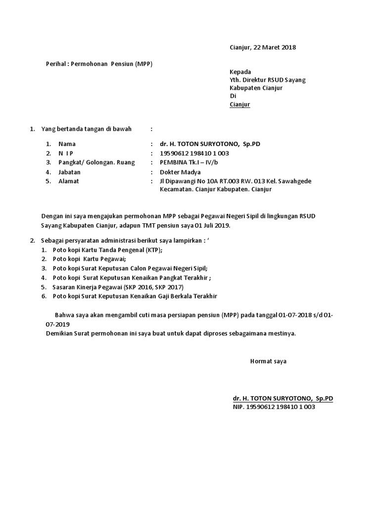 Sebagi contoh berikut ini tulisan surat permohonan pensiun pns terbaru. Contoh surat terlengkap surat ijin surat lamaran kerja perintah resmi permohonan keterangan undangan dinas niaga jalan dukungan pengantar. Pt tirta investama dc solo. Tapi ini tidak mutlak harus seperti ini ya. Surat permohonan permintaan pensiun terbaru dibuat oleh guru pns yang telah habis atau selesai masa baktinya tarpaut batas usia penuh. Contoh kartu identitas pensiun karip lalu tidak lama kemudian tidak sampai 1 bulan yaitu tanggal 29 november 2019 uang bapertarum saya sudah cair di rekening saya yaitu sebesar rp.
