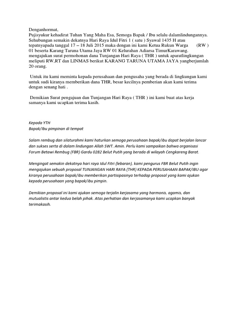 Contoh surat izin sakit ke perusahaan bagi pekerja contoh surat izin tidak masuk kerja atau contoh surat izin kerja pastinya sangat dibutuhkan. Surat pemberitahuan secara resmi bertujuan untuk memberitahu pihak tertentu tentang adanya suatu kegiatan di waktu yang akan datangsurat pemberitahuan secara resmiini biasanya dikeluarkan oleh berbagai jenis instansimulai dari instansi pendidikan sekolahan hingga perguruan tinggi instansi pemerintahan bahkan suatu perusahaan. Contoh surat pengajuan thr lebaran lebaran sebentar lagi guys tidak terasa puasa sudah mulai memasuki babak akhir. Surat izin merupakan surat yang berfungsi untuk memohon izin atau sebagai keterangan bahwa suatu pihak memberikan izin. Agar permohonan tersebut dikabulkan ada saatnya kamu akan meminta atau memohon bantuan kepada orang lain dan biasanya harus mengajukan surat permohonan. Untuk itu kami meminta kepada perusahaan dan pengusaha yang berada di lingkungan kami untuk sudi kiranya memberikan dana thr.