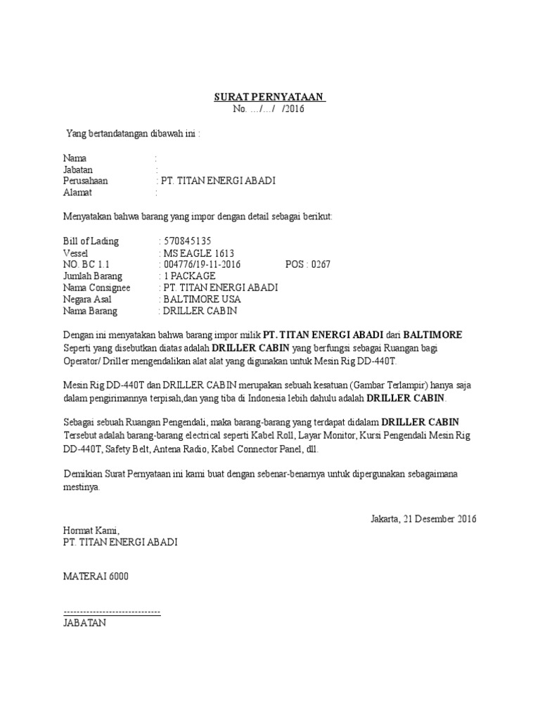 Surat pengiriman barang ini memiliki peranan yang sangat penting untuk kepuasan pelanggan ataupun perusahaan yang membeli barang. Selain surat pernyataan kerja dan belum menikah biasanya yang paling sering diminta ketika melamar pekerjaan adalah surat pernyataan bebas narkoba dan obat terlarang. Dengan hormat sehubungan dengan adanya kebutuhan barang baik berupa barang masuk maupun barang keluar di gedung gudang satudua merapi jaya dengan surat ini kami bermaksud untuk memohon bantuan pt. Surat kepemilikan barang yaitu surat yang berisi pernyataan atas kepemilikan suatu barang yang dibuat oleh pemilik atau pihak yang berwenang atas barang tersebut. 15 contoh surat permintaan barang yang benar dan terlengkap dalam menjalankan roda perusahaan tentu tidak bisa terlepas dari urusan surat menyurat. Surat pernyataan kepemilikan barang ini dibuat untuk tujuan memberikan keterangan atas status suatu barang dalam bentuk penegasan dan informasi atas pemilik suatu barang untuk suatu keperluan.