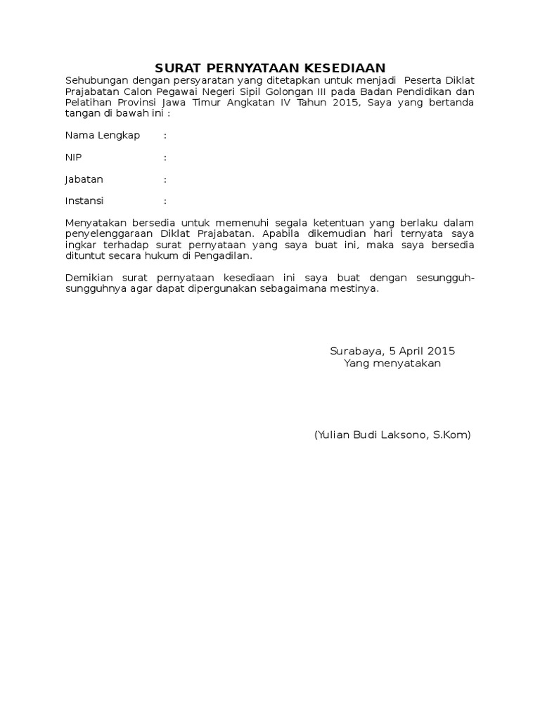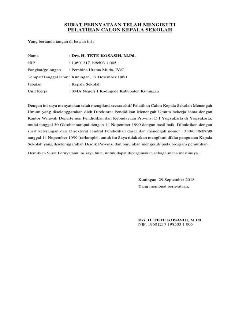 Contoh surat pernyataan mengikuti diklat. Hanafiah mt nip. Contoh surat pernyataan kesanggupan mengikuti pelatihan diklat home contoh surat pernyataan kesanggupan mengikuti pelatihan diklat by admin on february 2 2020 168 views. Silahkan kunjungi postingan contoh surat rekomendasi mengikuti pelatihan yang diadakan oleh universitas perguruan tinggi oleh kepala sekolah untuk membaca artikel selengkapnya. Surat pernyataan bersedia mengikuti diklat dan uji kompetensi pendidik pnf. Pada kesempatan yang berbahagia ini kami mencoba memberikan kepada seluruh kepala sekolah yang ingin mengikuti diklat penguatan kepala sekolah berupa contoh surat pernyataan bersedia dan sanggup mengikuti diklat penguatan. 195608151989021001 pangkat golongan.
