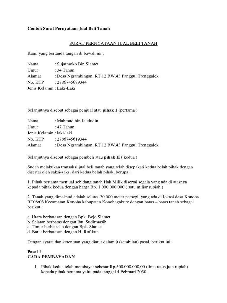 134 seri 2453a yang terletak di jl. Berdasarkan hal tersebut diatas dengan ini saya menyatakan dengan sebenarnya bahwa saya akan menjual tanah saya tersebut dengan harga rp. Jika kita memiliki harta benda maka sangat penting bagi kita untuk menjaga dan merawat harta tersebut seperti harta tanah contohnya. Contoh surat pernyataan jual beli tanah. Surat ini juga menjadi bukti bahwa kedua belah pihak yaitu penjual dan pembeli tanah sepakat untuk melakukan transaksi secara sah. Contoh surat keterangan jual beli tanah ini bertujuan untuk memberikan panduan atau referensi bagi anda dalam melakukan transaksi jual beli tanah.