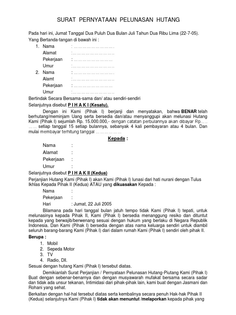 Contoh surat pernyataan pelunasan hutang pada bank. Kuala istana 10 juli 2017. Ada dua tipe manusia dalam menjalani kehidupannya ada yang mengandalkan gaji atau upah untuk biaya hidupnya tipe orang seperti ini biasa disebut dengan pegawai karyawan dan sejenisnya. 15 contoh surat pernyataan hutang yang benar dan paling lengkap setiap orang tentu saja membutuhkan uang untuk biaya kehidupan sehari hari maupun untuk keperluan lainnya. Tipe orang seperti ini biasa disebut dengan pengusaha. 15 contoh surat perjanjian hutang yang benar dan terlengkap sebuah perjanjian merupakan kesepakatan yang dibuat oleh dua orang atau dua pihak mengenai sesuatu hal tertentu. Contoh surat pernyataan pelunasan hutang kepada bank.