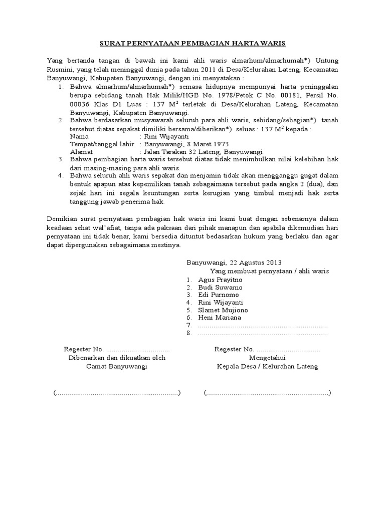 2 contoh surat pernyataan keterangan waris surat keterangan waris adalah surat yang diberikan oleh pemilik warisan kepada ahli warisnya. Dan dibuat dalam 2 dua rangkap dan diberi meterai serta mempunyai kekuatan hukum yang sama dan mengikat kedua. Contoh surat pernyataan harta gono gini have a graphic associated with the othercontoh surat pernyataan harta gono gini it also will feature a picture of a sort that may be observed in the gallery of contoh surat pernyataan harta gono gini. The collection that comprising chosen picture and the best amongst others. Seperti contoh warisan berupa 1 unit rumah atau mobil atau gudang.