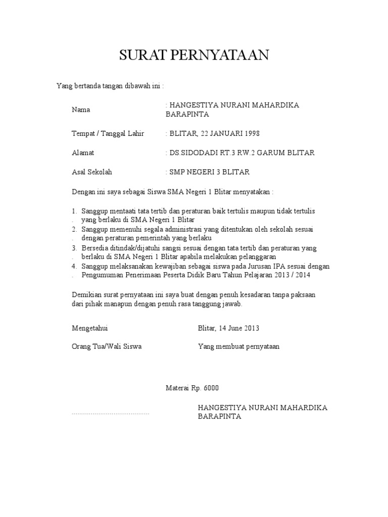 Contoh surat pernyataan orang tua siswa baru dan untuk kegiatan. Diberlakukan bagi siswa yang melanggar tata tertib peserta didik yang bersifat dan kategori amat sangat berat. Contoh surat pernyataan siswa sekolah mempunyai tata tertib atau aturan aturan yang berlaku bagi siswanya maupun gurunya kali contoh surat pernyataan siswa diperuntukan untuk siswa siswi yang melanggar tata tertib sekolah atau aturan aturan sekolah supaya membuat efek jerah kepada siswa yang melanggar tata tertib sekolah atau aturan aturan contoh surat pernyataan siswa sangatlah simpel dan. Peraturan sekolah yang berupa tata tertib sekolah merupakan kumpulan aturanaturan yang dibuat secara tertulis dan mengikat di lingkungan sekolah. Pelajaran akan dimulai setiap jam 0730 setiap harinya kecuali hari senin upacara bendera. Mulia dari tata tertib untuk siswa sampai sanksi yang akan diberikan kepada siswa.