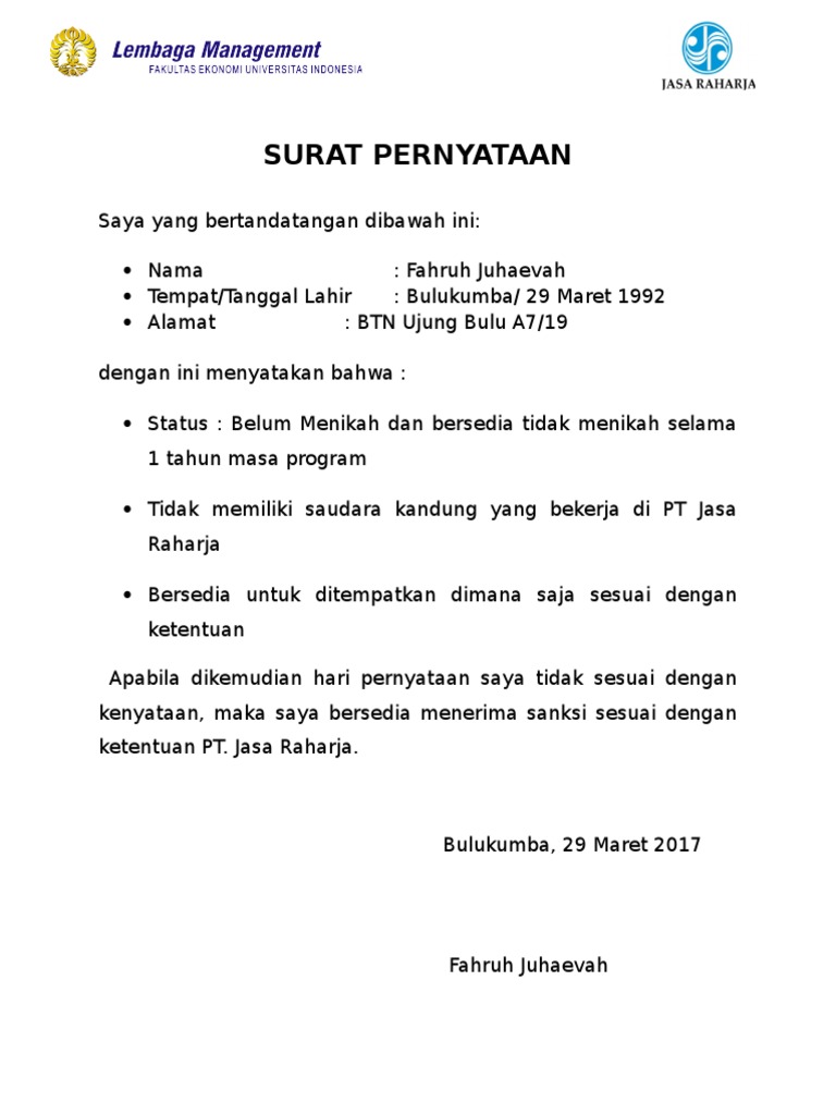 Contoh surat pernyataan tidak memiliki orang tua yang bekerja di jasa raharja. Jika anda ingin membuat surat pernyataan untuk suatu keperluan maka anda perlu tahu format yang benar dalam membuatnya. Kali ini kita akan membahas materi yang masih berkaitan dengan melamar pekerjaan yaitu mengenai contoh surat pernyataan tidak memiliki hubungan keluarga. Ada yang pernyataan diri sendiri orang tua desa pembimbing dan lainnya. 15 contoh surat pernyataan paling lengkap untuk berbagai kebutuhan belakangan ini penggunaan surat memang bisa dibilang sudah semakin minim terlebih untuk urusan pribadi. Contoh surat pernyataan tidak memiliki hubungan keluarga pada salah satu kesempatan yang lalu kita telah membahas mengenai contoh surat lamaran kerja pabrik. Contoh surat pernyataan orang tua 4 contoh surat pernyataan orang tua wali murid berikut adalah contoh surat pernyataan orang tua murid atau wali yang bisa dipergunakan untuk siswa siswi sd smp sma atau mahasiswa yg sedang kuliah.