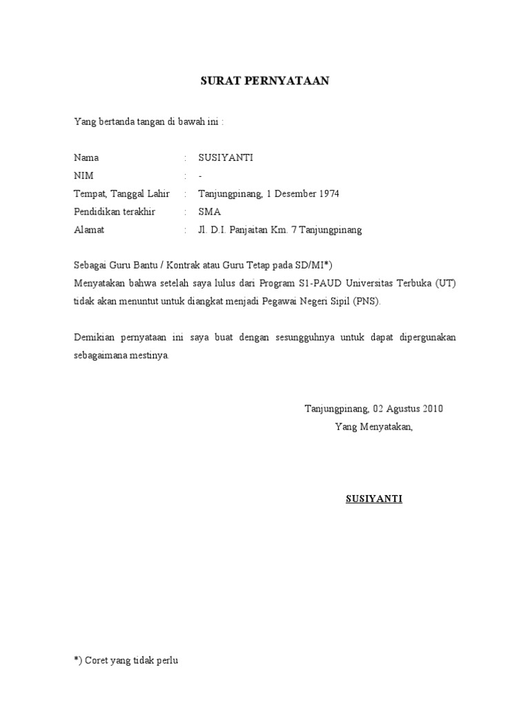 Contoh surat pernyataan cpns 2017 resmi menpan lulusan sma smk d3 d4 s1 s2 semua jurusan bank bumn cpns 2018 daerah provinsi kementerian cpns 2018. 2saya tidak menuntut mutasi baik mutasi sebagai staf maupun mutasi ke upt lainselama 10 tahun terhitung sejak diangkat menjadi cpns. Contoh surat pernyataan kerja mengenai kesanggupan. Surat ini biasanya dibuat oleh guru honor atau guru bantu yang sedang mengikuti pendidikan lebih tinggi sedangkan dia juga mengajar sebagai guru di suatu sekolah. Contoh surat pernyataan cpns. Surat pernyataan tidak menuntut penyetaraan pangkat dan golongan 9.