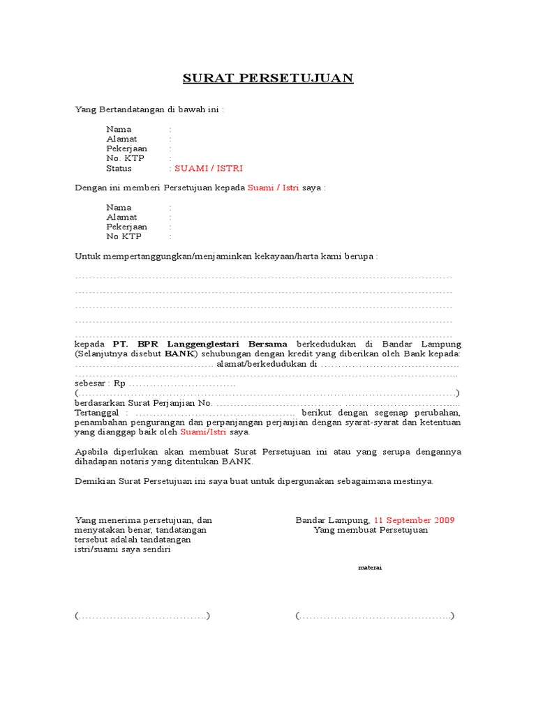 Contoh surat pernyataan persetujuan dari suami atau istri dalam lingkup tertentu surat pernyataan persetujuan yang dibuat oleh suami atau istri juga diperlukan oleh instansi tertentu. Berikut ini adalah sebuah contoh surat pernyataan atau persetujuan suamiistri untuk mengajukan pinjaman atau kredit bankkoperasi.