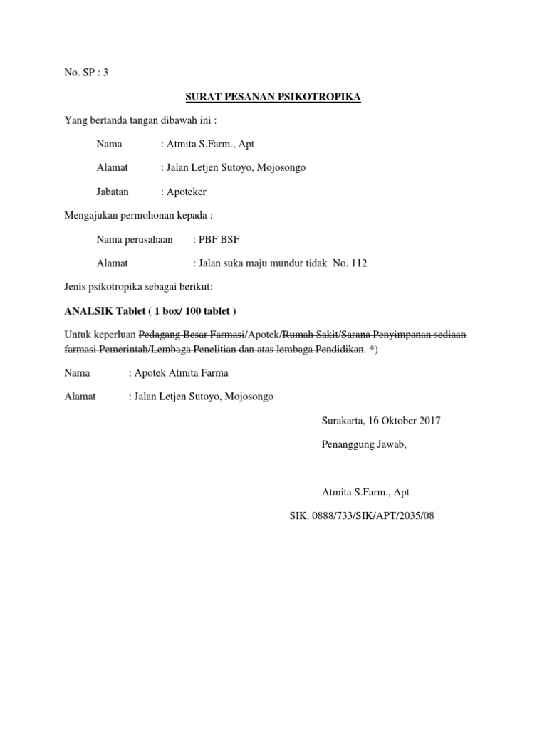 Surat pesanan ini sangat penting terutama sebagai bukti jika ingin klaim. 2 surat pesanan sebagaimana dimaksud pada ayat 1 huruf a hanya dapat berlaku untuk masing masing narkotika psikotropika atau prekursor farmasi. Shinta widya lestari ssi apt. Lompat ke halaman. Format gambar contoh surat pesanan narkotika dan psikotropika terbaik 2019. Lampiran 14 surat pesanan narkotika 173.
