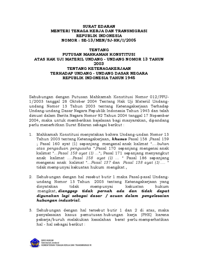 Kesalahan berat dalam pemutusan hubungan kerja tuesday 24 apr 18 pemutusan hubungan kerja phk oleh pengusaha ialah phk dimana kehendak atau prakarsanya berasal dari pengusaha karena adanya pelanggaran atau kesalahan yang dilakukan oleh pekerjaburuh atau mungkin karena faktor faktor lain seperti pengurangan tenaga kerja perusahaan tutup karena merugi perubahan status dan sebagainya. 012puu i2003 tersebut pada tanggal 7 januari 2005 menteri tenaga kerja dan transmigrasi menakertrans juga sudah mengeluarkan surat edaran no. Materi pada artikel kali ini adalah mengenai surat pemutusan hubungan kerja phk. Yakni phk dapat dilakukan setelah ada putusan pidana yang mempunyai kekuatan hukum tetap atau apabila pekerja ditahan dan tidak dapat melaksanakan pekerjaan maka berlaku ketentuan pasal 160 uu ketenagakerjaan. Contoh surat phk selamat datang kembali di situs kami para pembaca sekalian. Sebagai tindak lanjut atas putusan mk ri no.